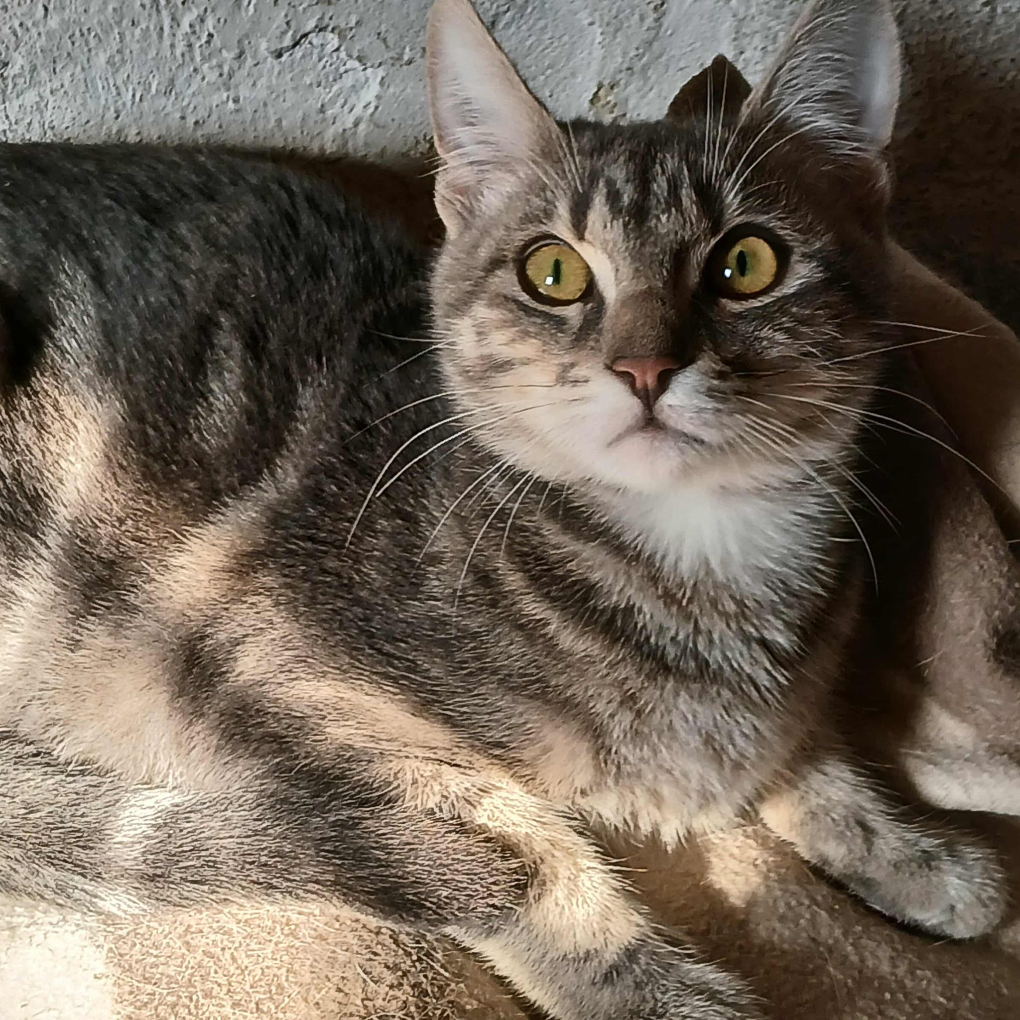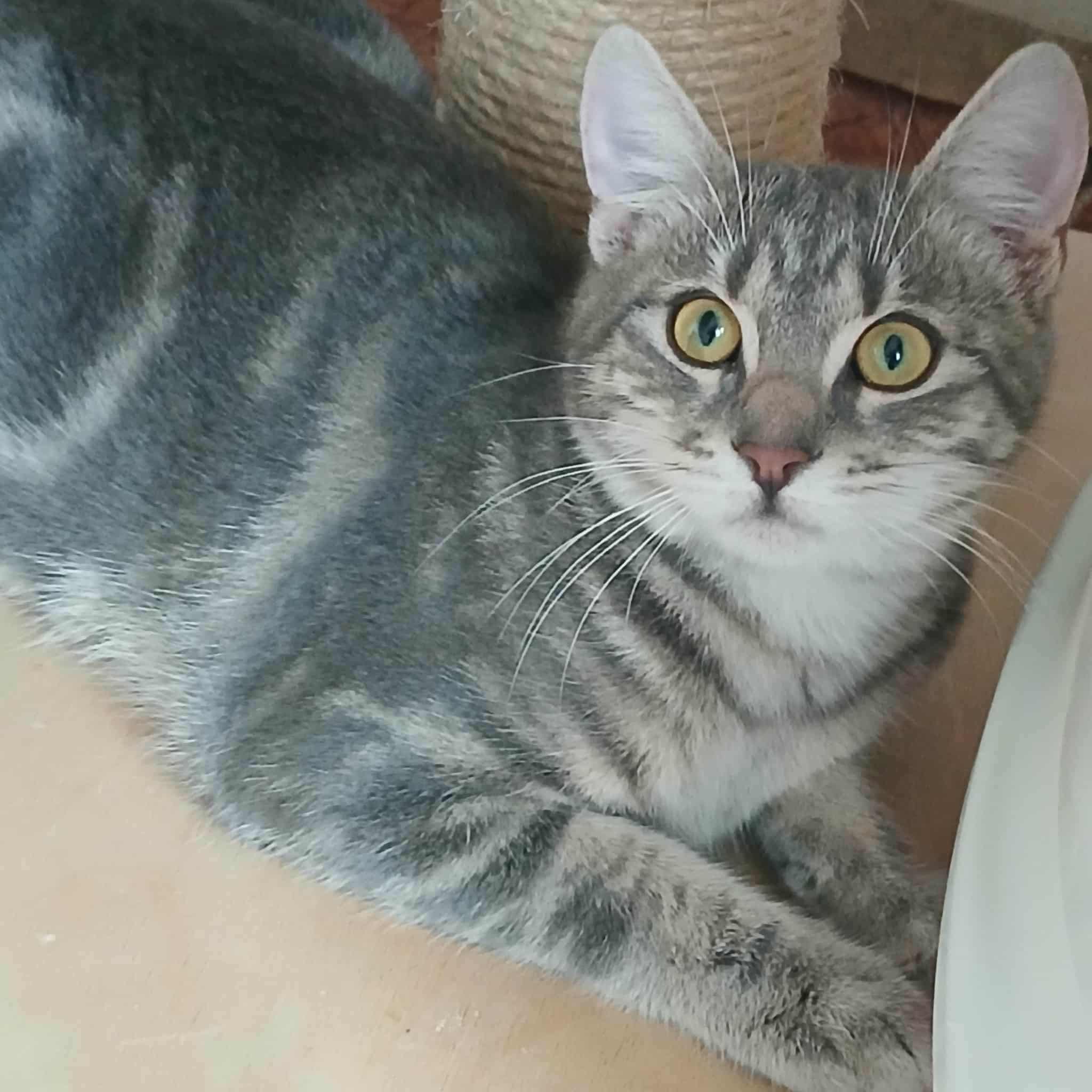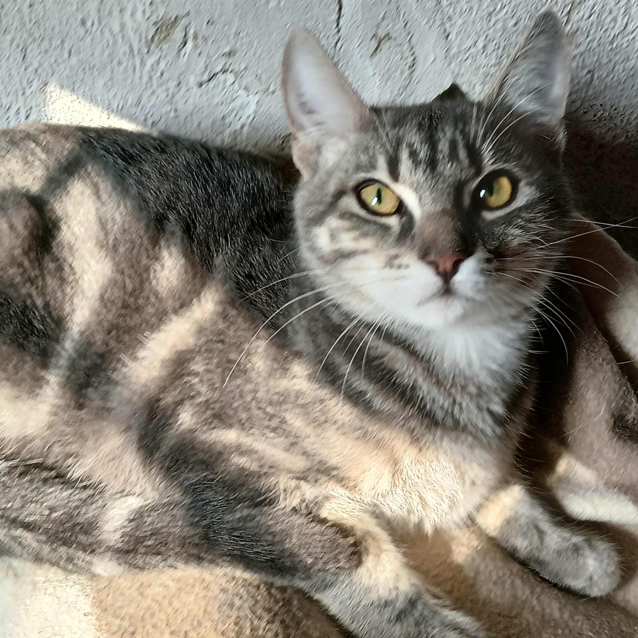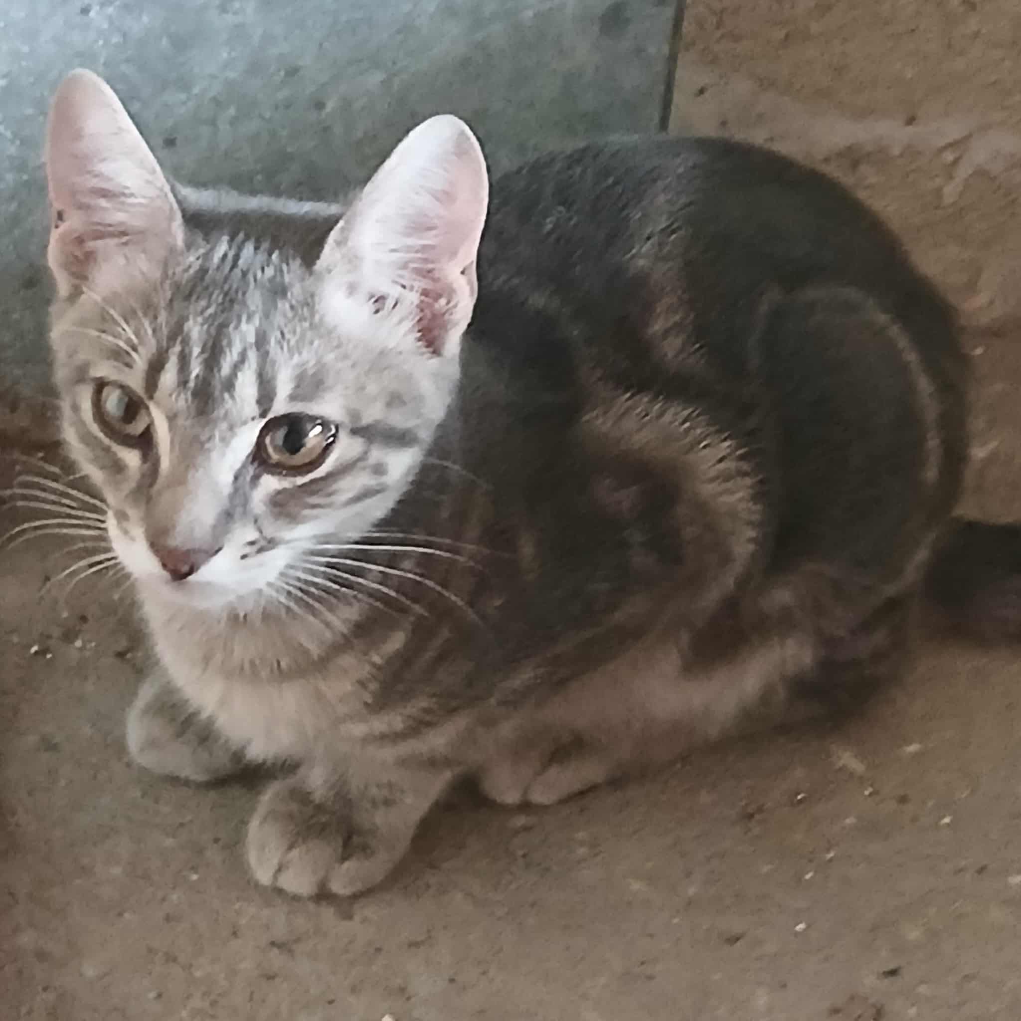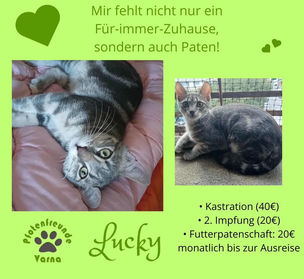 Seine Geschichte: Marinela hat gerade ein kleines rot-weißes Katzenmädchen bei sich aufgenommen, da findet sie in der Nähe ihrer Wohnung diesen Jungen. Sie hat kurz vorher eine tote graue Katze gesehen, vielleicht war es die Mutter dieses Jungen. Leider gibt es in der Nähe eine Handvoll freilaufender Hunde und öfter tödliche Angriffe auf Katzen. Wir sind so froh, dass sie diesen Kleinen in Sicherheit gebracht hat! Der Katerjunge wird auf ca. 11 Monate geschätzt (Stand 04.2026). Er hat den schönen Namen Lucky bekommen.
