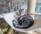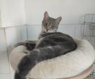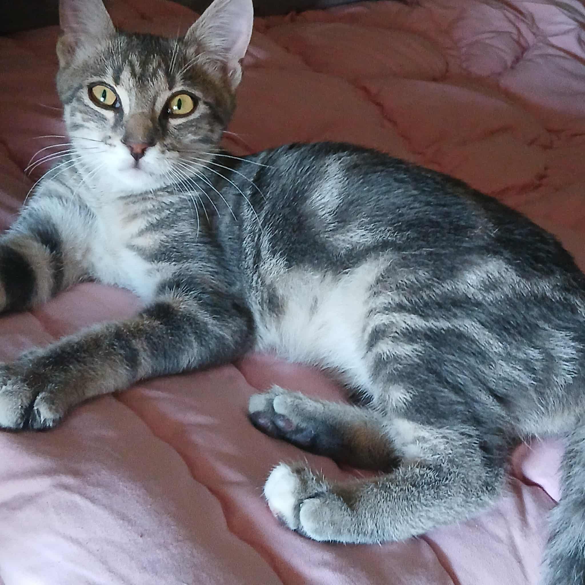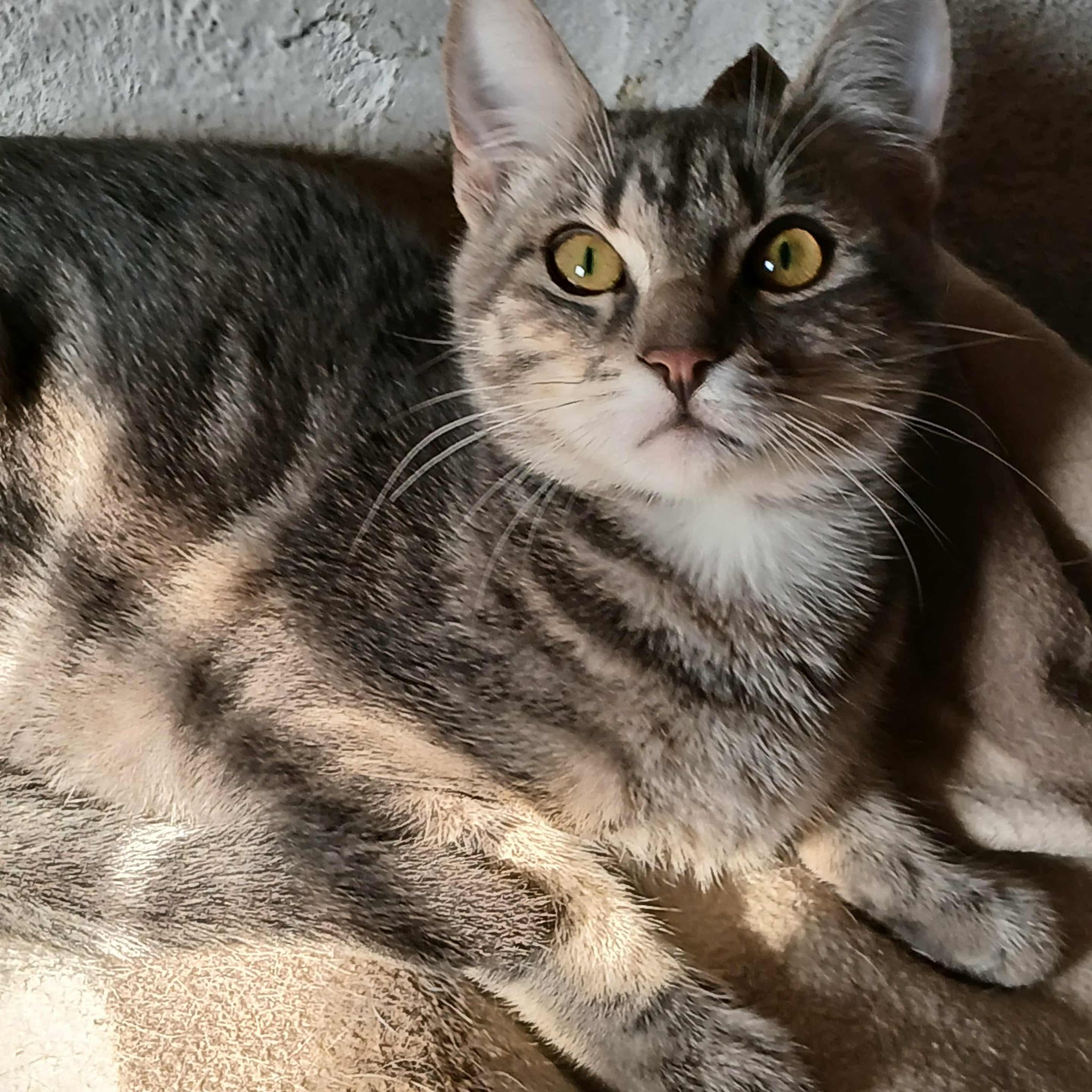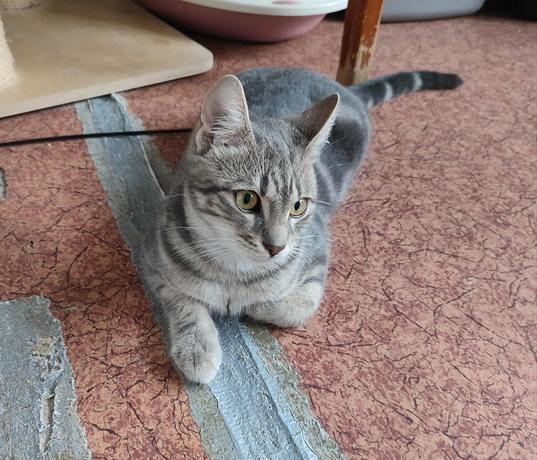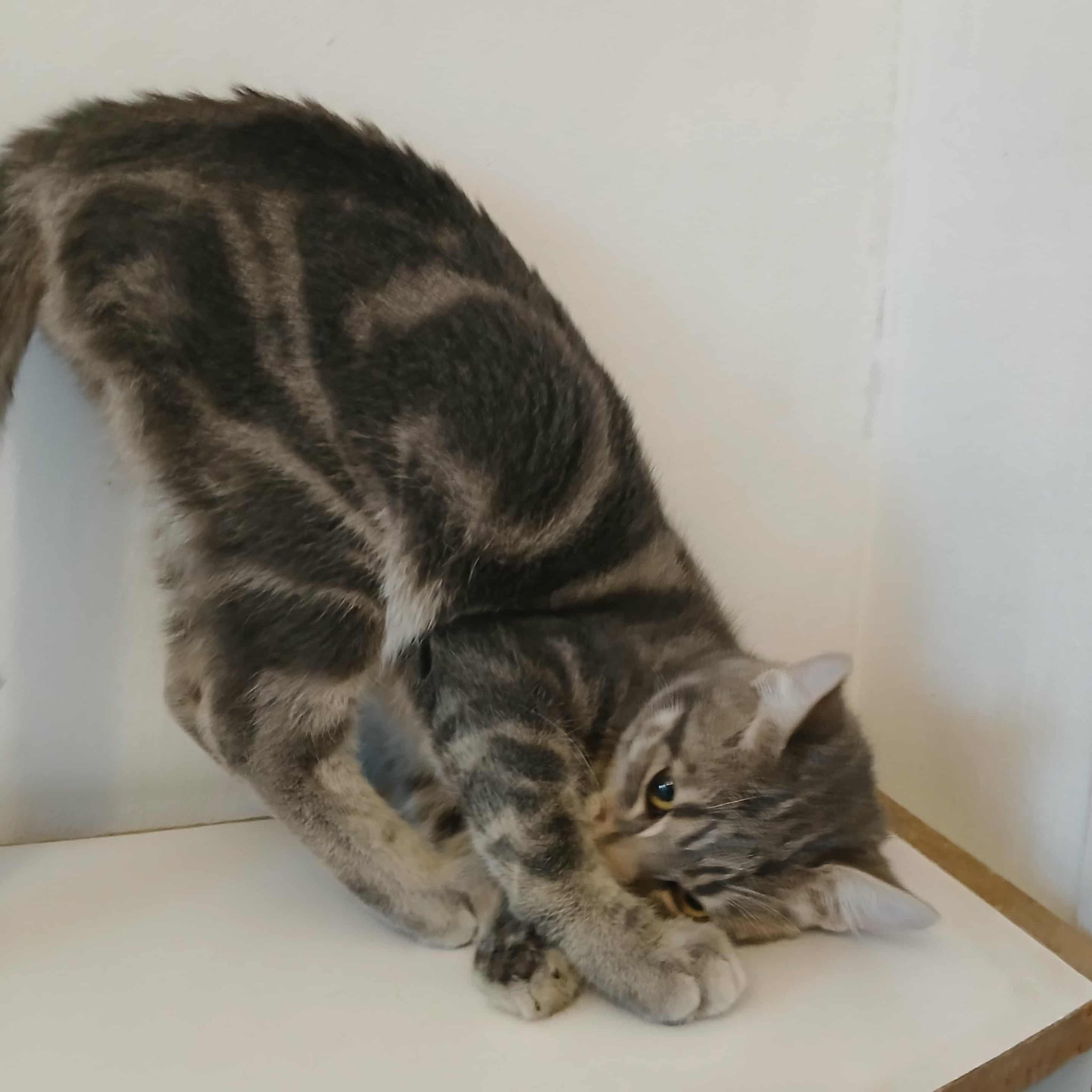 Seine Geschichte: Marinela hat gerade ein kleines rot-weißes Katzenmädchen bei sich aufgenommen, da findet sie in der Nähe ihrer Wohnung diesen Jungen. Sie hat kurz vorher eine tote graue Katze gesehen, vielleicht war es die Mutter dieses Jungen. Leider gibt es in der Nähe eine Handvoll freilaufender Hunde und öfter tödliche Angriffe auf Katzen. Wir sind so froh, dass sie diesen Kleinen in Sicherheit gebracht hat! Der Katerjunge wird auf ca. 11 Monate geschätzt (Stand 04.2026). Er hat den schönen Namen Lucky bekommen.