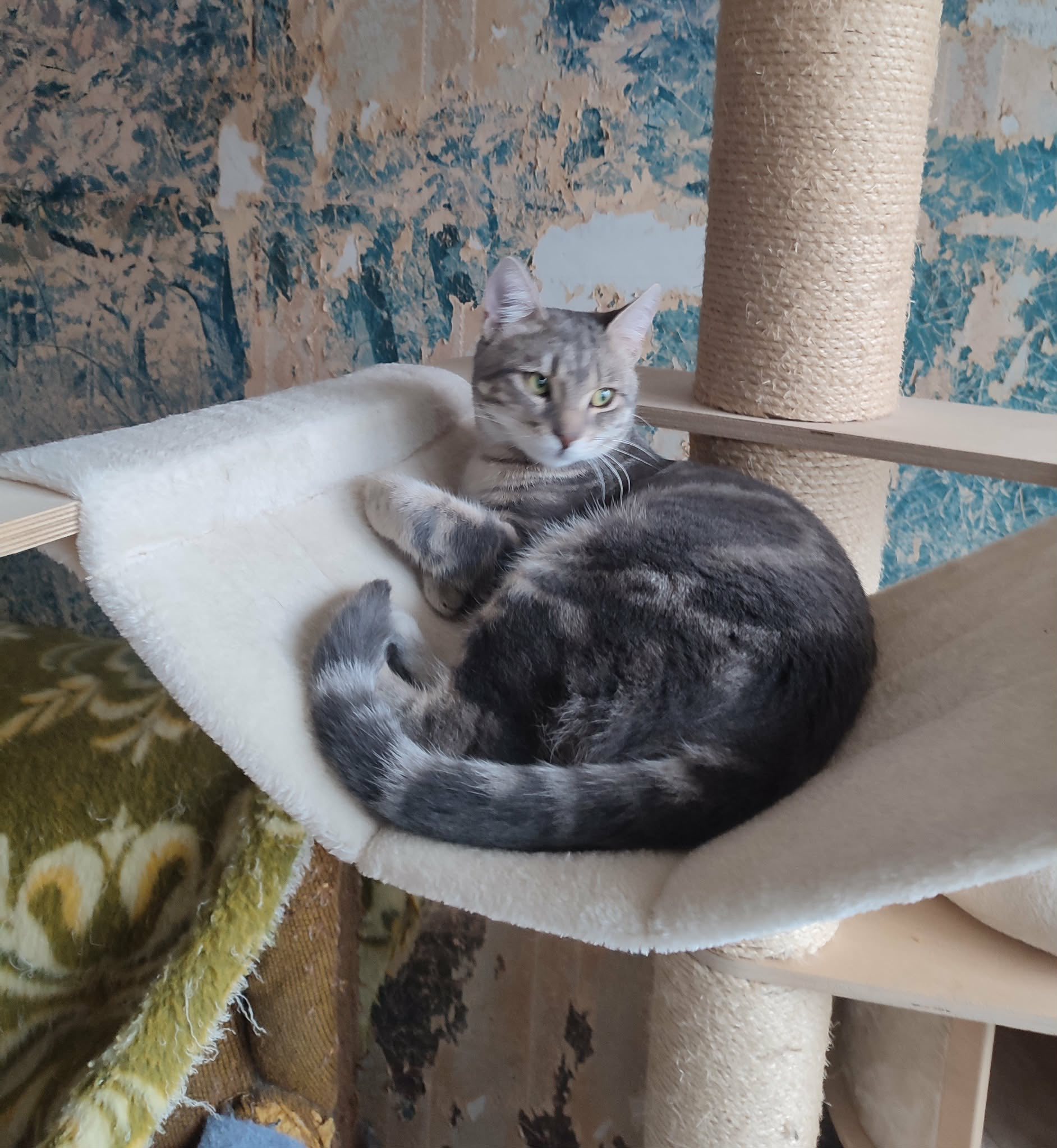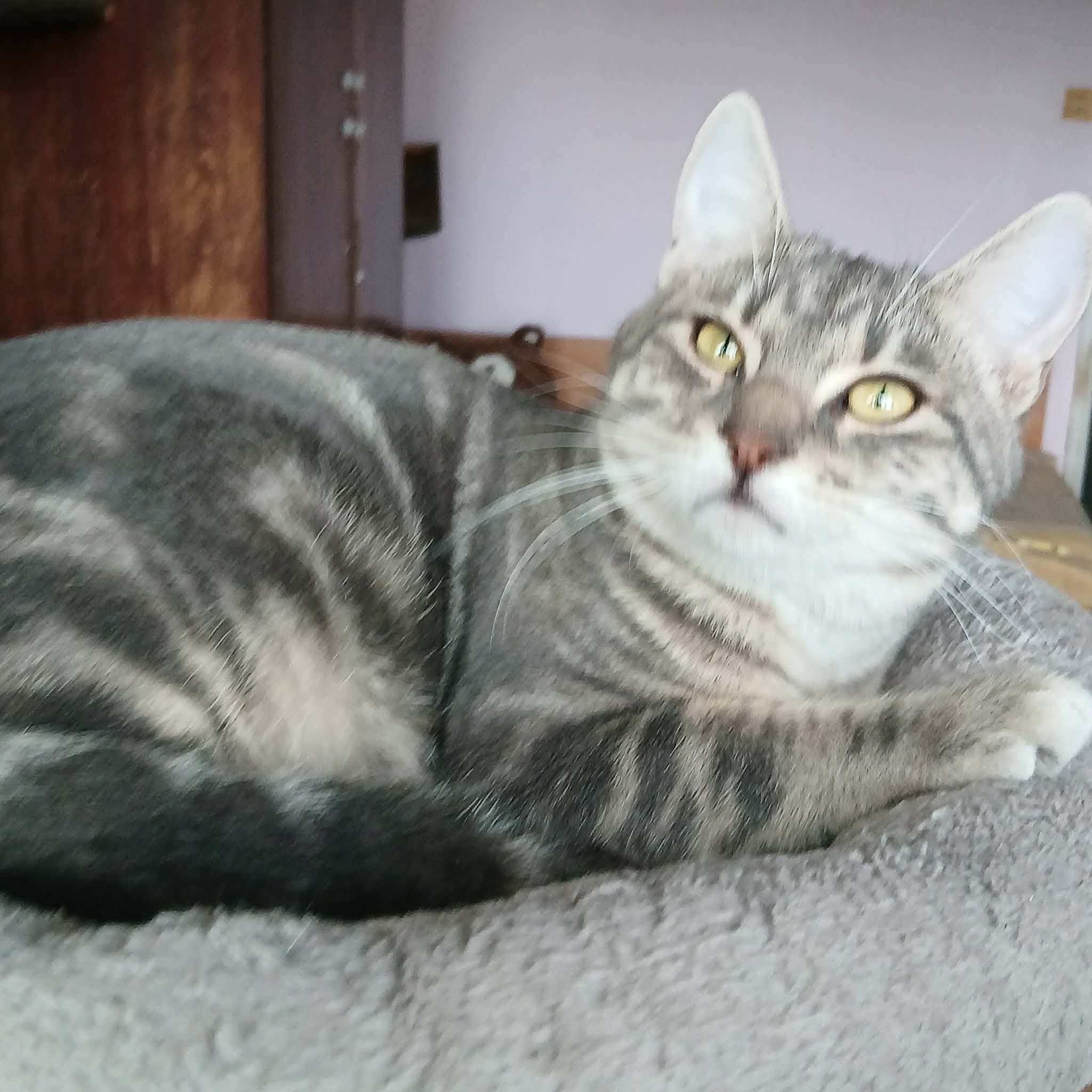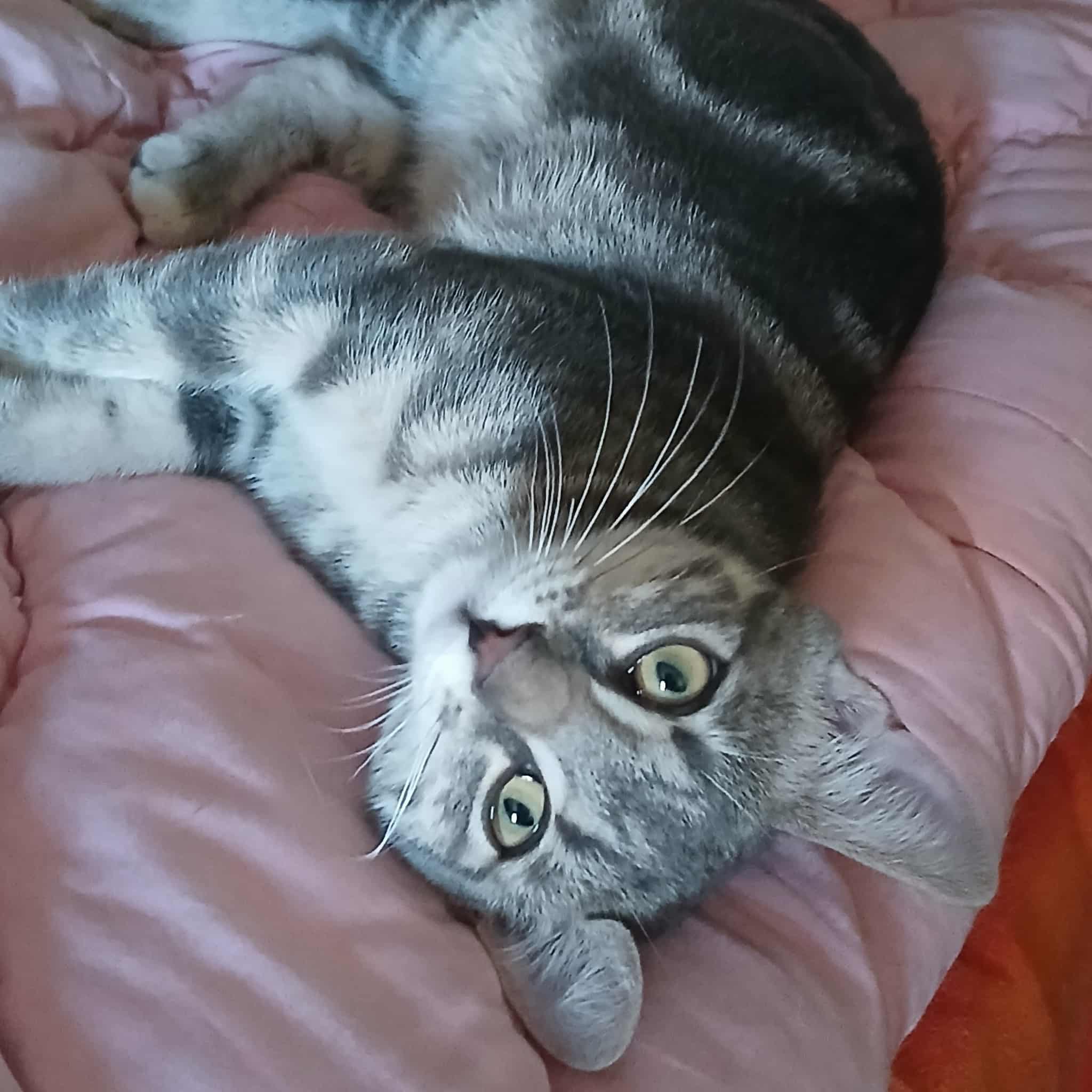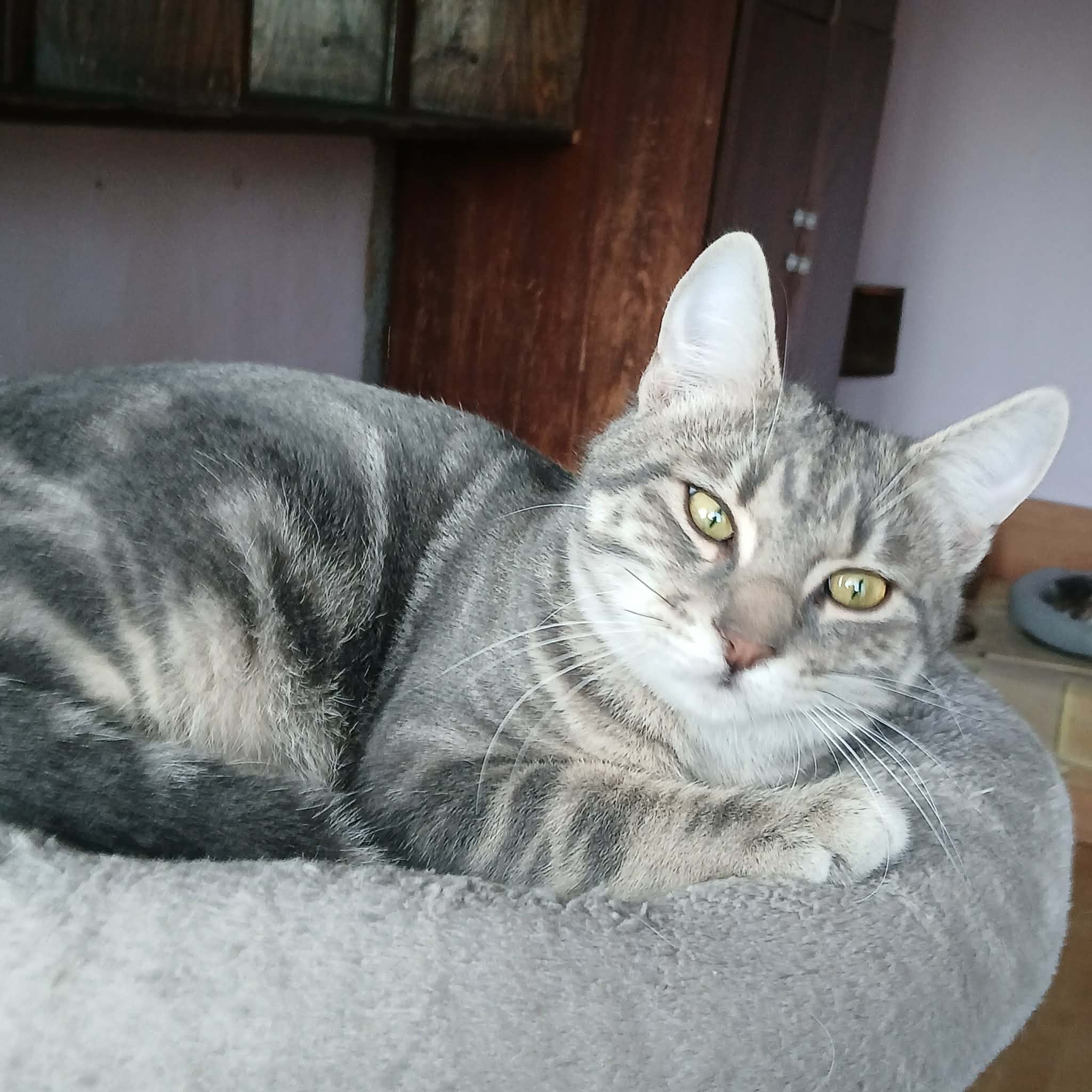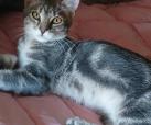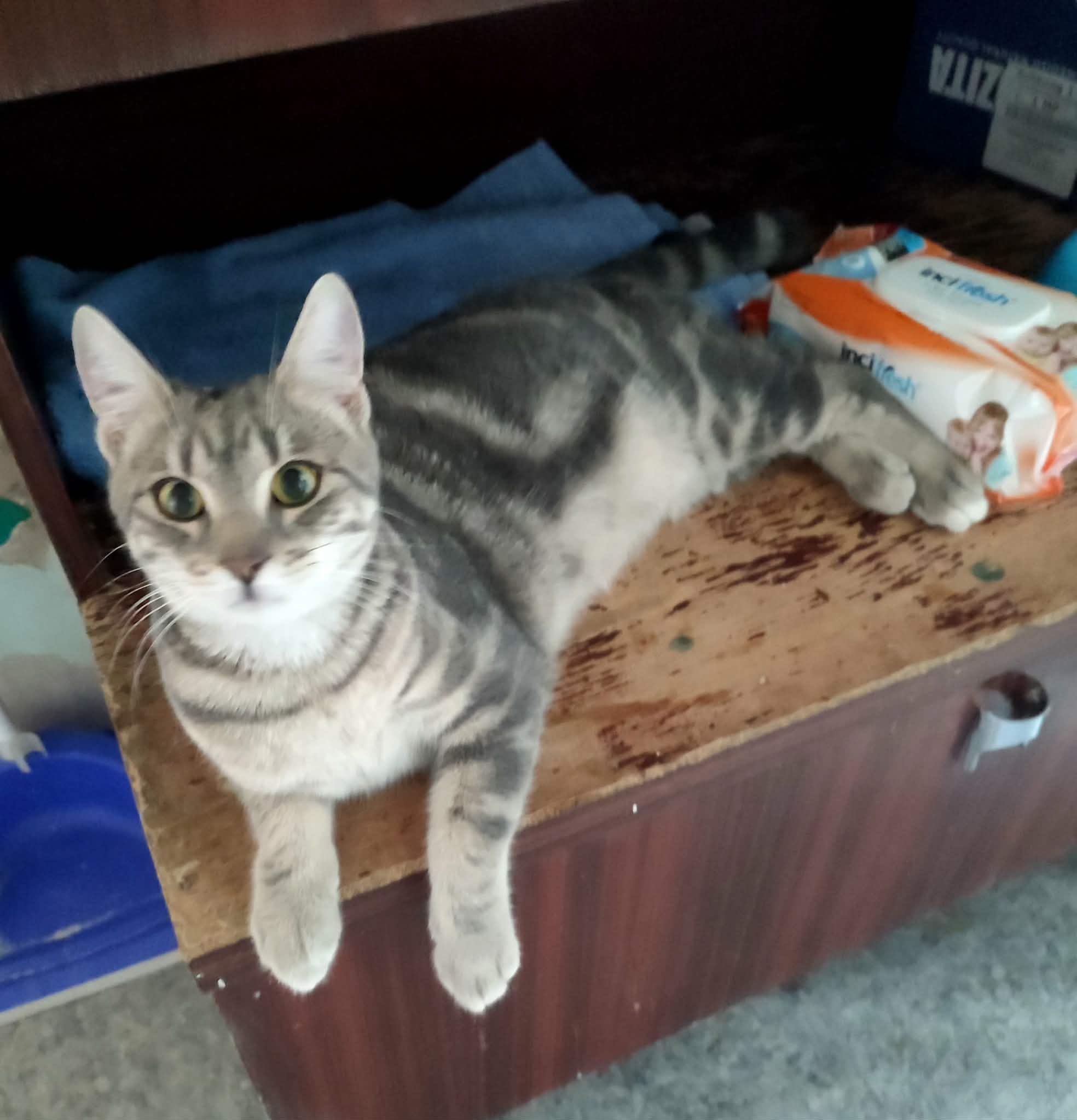 Seine Geschichte: Marinela hat gerade ein kleines rot-weißes Katzenmädchen bei sich aufgenommen, da findet sie in der Nähe ihrer Wohnung diesen Jungen. Sie hat kurz vorher eine tote graue Katze gesehen, vielleicht war es die Mutter dieses Jungen. Leider gibt es in der Nähe eine Handvoll freilaufender Hunde und öfter tödliche Angriffe auf Katzen. Wir sind so froh, dass sie diesen Kleinen in Sicherheit gebracht hat! Der Katerjunge wird auf ca. 11 Monate geschätzt (Stand 04.2026). Er hat den schönen Namen Lucky bekommen.